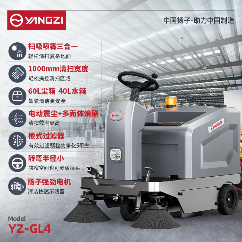 揚(yáng)子駕駛式商用/工業(yè)掃地機(jī),60L集塵箱,1000mm清掃寬度,40L清水箱,掃地+吸塵+噴霧控塵,高效清掃,一小時(shí)清掃6500㎡